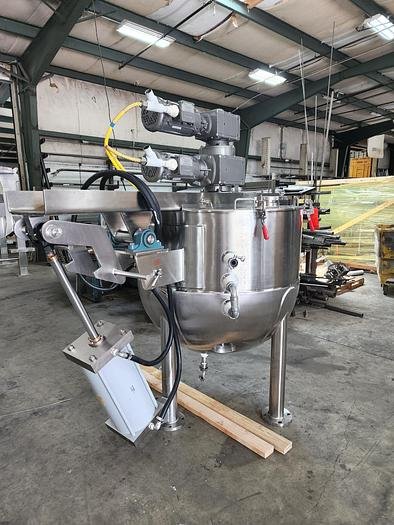 This is a 2017 Lee Model 150D9MT agitated kettle, offering robust features tailored for mixing applications. Constructed from 316 stainless steel, it ensures durability and resistance to corrosion. With a capacity of 150 gallons, the kettle is jacketed, facilitating efficient heating or cooling processes during operation.