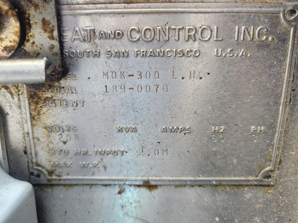 The Heat and Control MOK-300 L.H. Compact Fryer is a used unit offering a capacity of 300 lbs per hour, suitable for kettle or batch fried potato chips. Recently taken out of service to accommodate a newer, larger model, it has been functional and effective since its installation. This fryer features an integrated outfeed conveyor and is operated through two control panels that manage burner and unit controls.